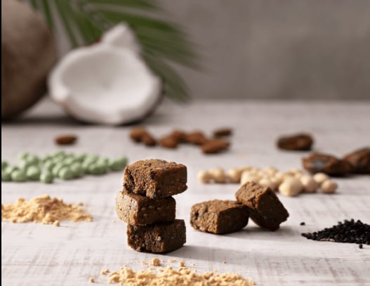 プラントベース素材にこだわり、8つのギルトフリーをポリシーにした、手でつまんで食べられるソフトクッキータイプのプロテインスイーツです。